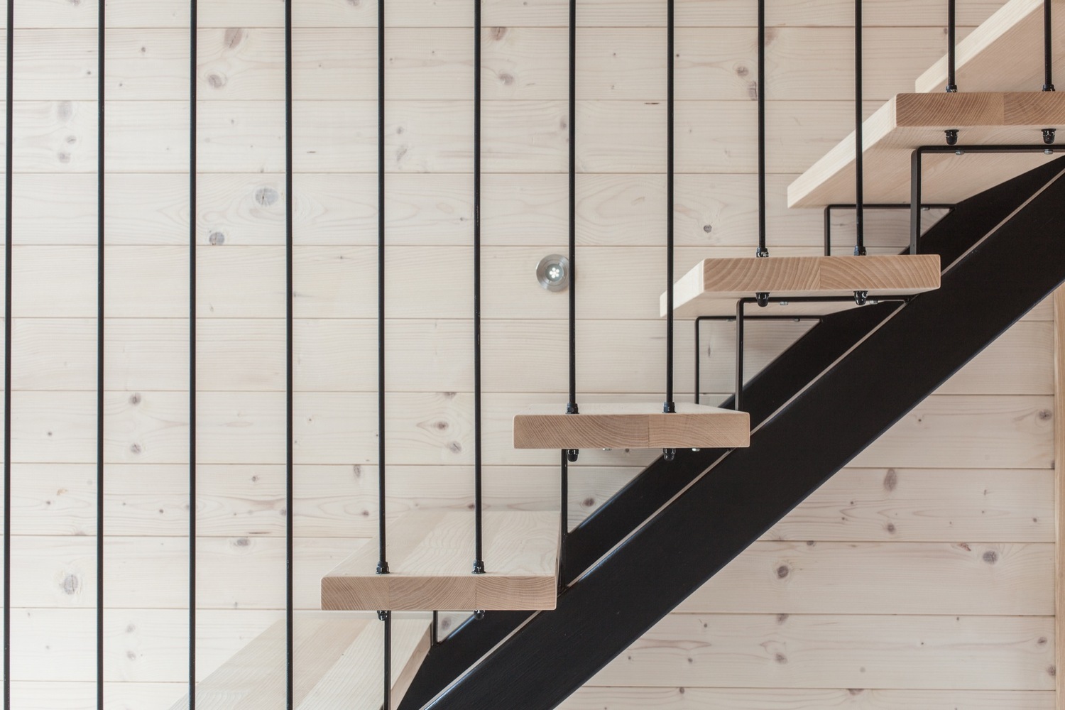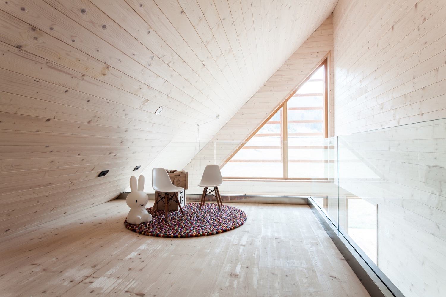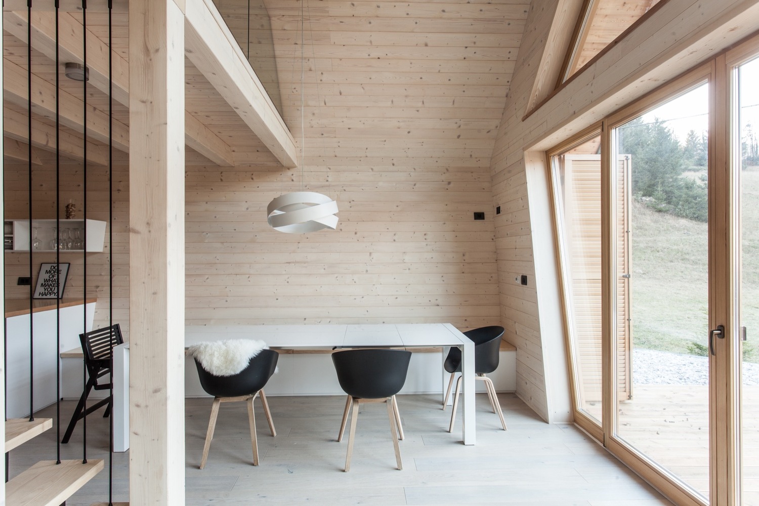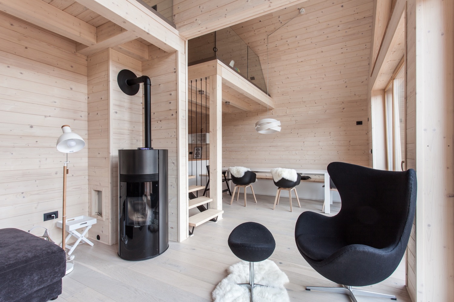 除了浴室外,所有房間都面向巨大的玻璃幕墻,讓自然環境的色彩在每一間房都能親切感受到。客廳、餐廳、廚房和帶桑拿浴室的浴室位于一樓,而兩間臥室位于樓上,可俯瞰一樓的房間。